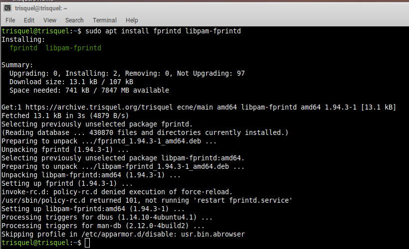 To utilize our USB fingerprint reader (TPE-F4500) with Trisquel 12+ you will need to open a terminal and install a few packages. Then utilize a command to enroll your fingerprint. Afterward you can login to the system using just your fingerprint at the normal graphical login screen.