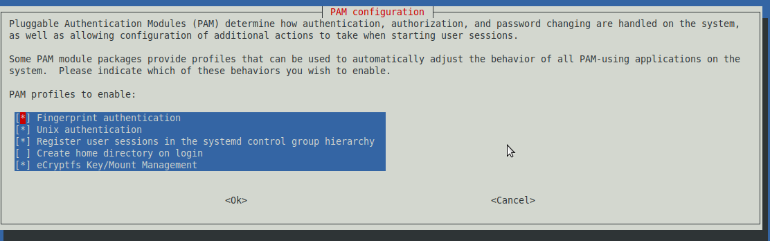 7. Select Fingerprint Authentication using your up and down arrow keys and the spacebar, then tab to select ok and hit enter